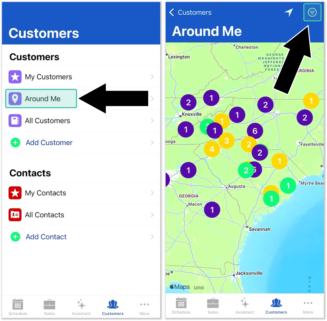To access the new filters, open SalesLink Flex and select “Around Me” from the Customers menu. Then, tap the filter icon
