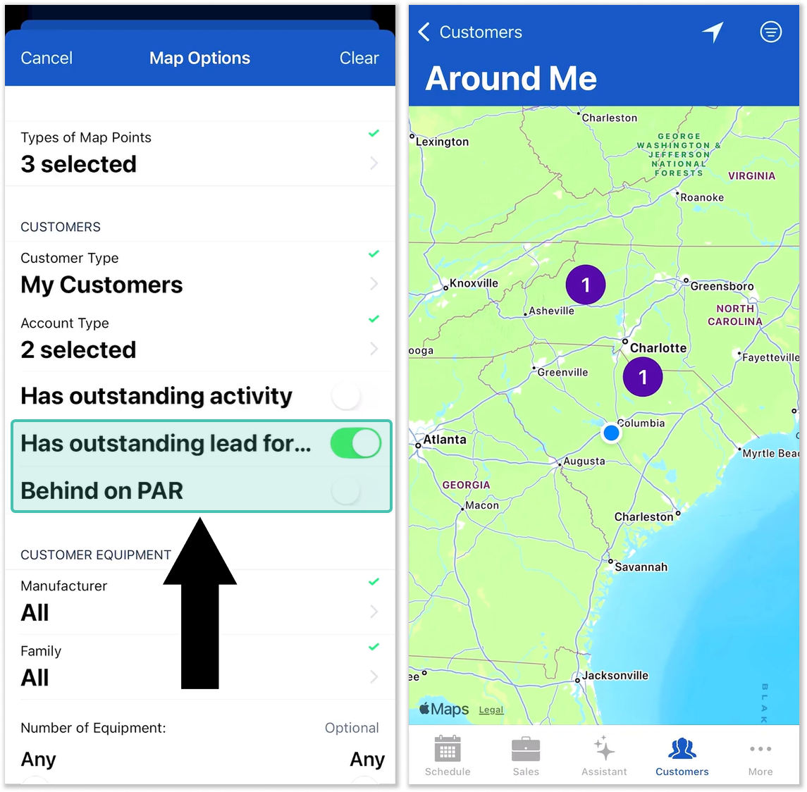 In a previous update, we added a number of new filters to Around Me, allowing reps to filter by equipment, account type, outstanding sales activity, and more. Now, two new filters are available, further deepening the customization available!