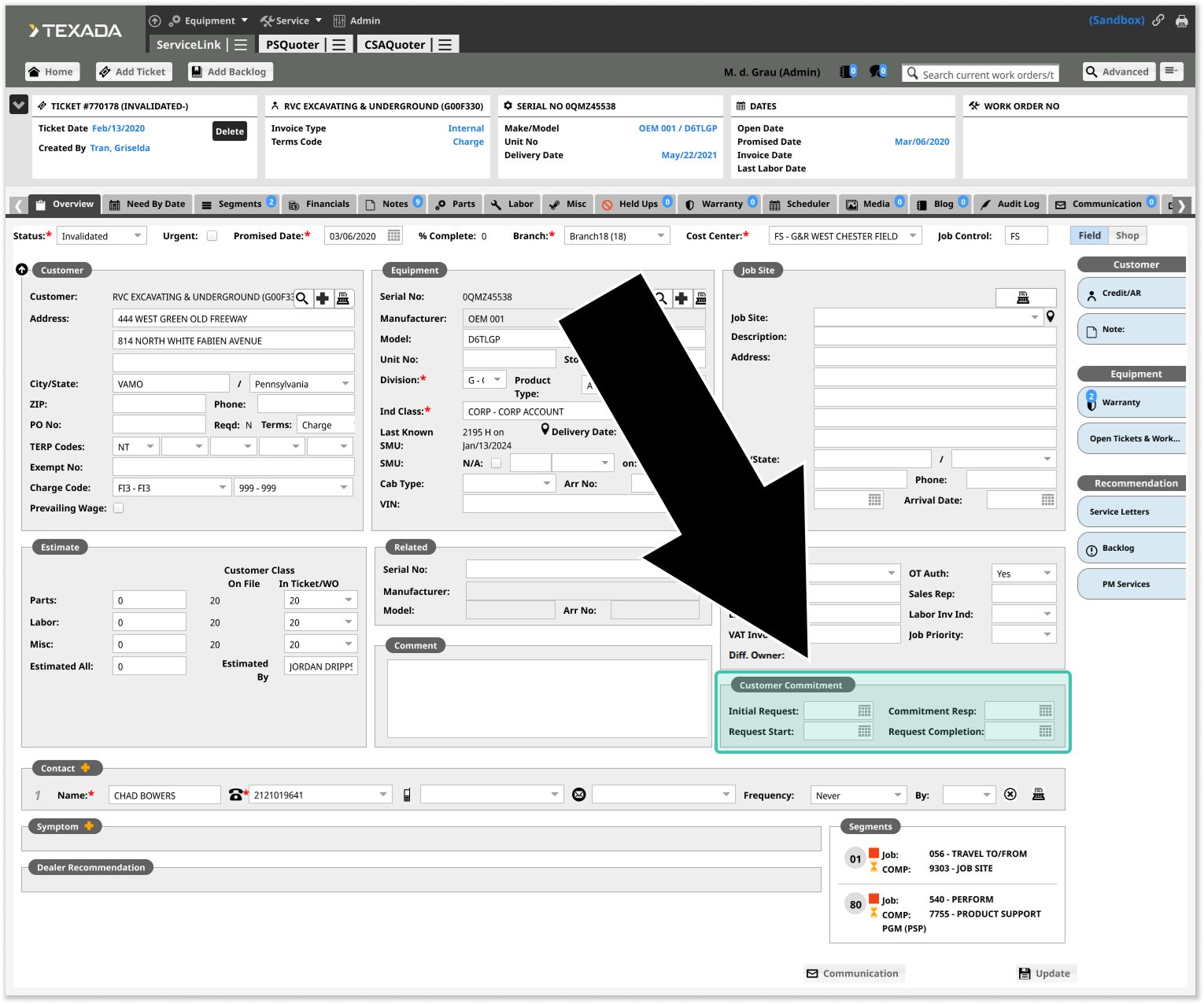 The new fields are located in the new Customer Commitment section near the bottom-right corner of the Work Order → Overview tab. Within this section, you’ll see four new date fields: