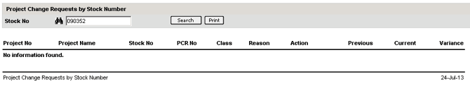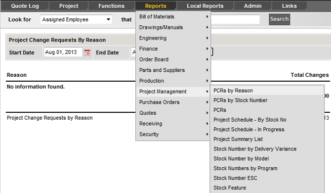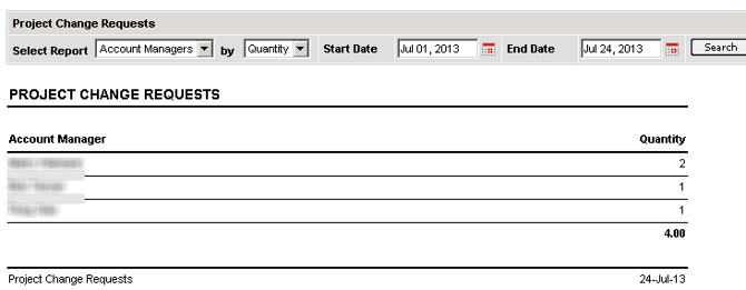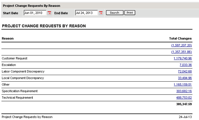 This report shows Project Change Requests based on your chosen parameters. A menu bar at the top of the screen presents the available data points and provides a date range for your search.