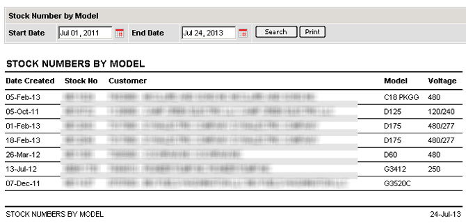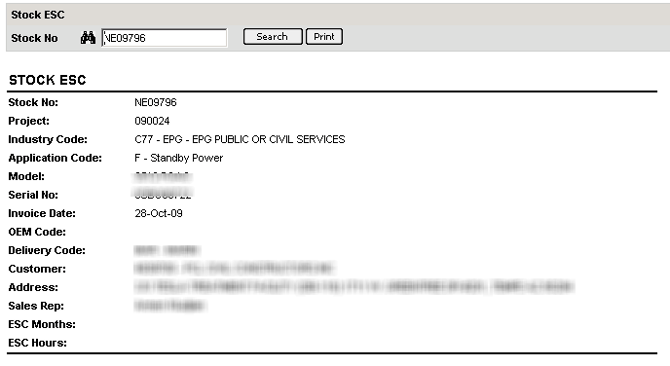This report lists a stock number’s details, including customer, sales rep, and extended warranty months and hours.