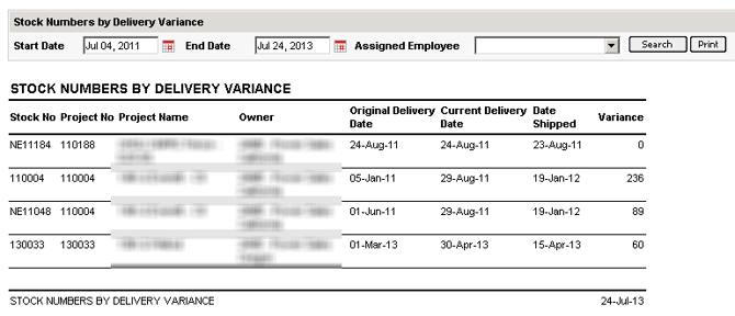 This report creates a list of stock numbers whose original delivery date falls between the specified dates. This list displays the original and current delivery dates, the variance between those dates, and the date it was shipped. You can filter this report by employee.