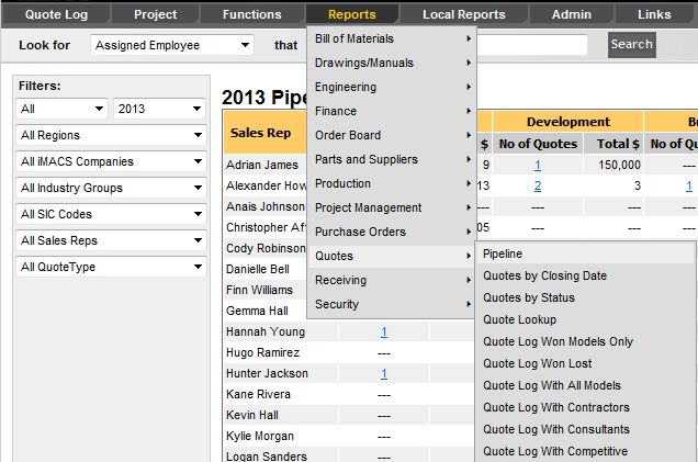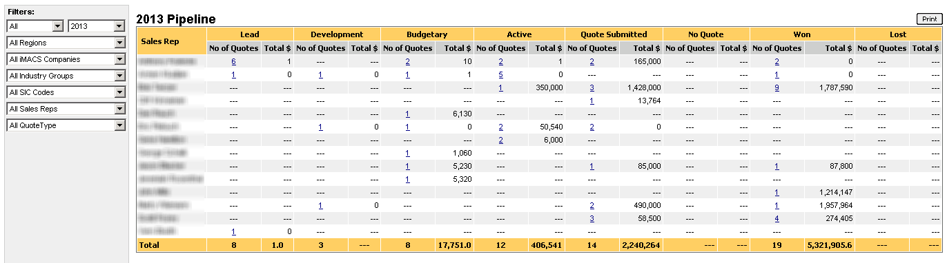 This report is your iMACS sales funnel by status. Filter by date, region, company, industry, reps and type.