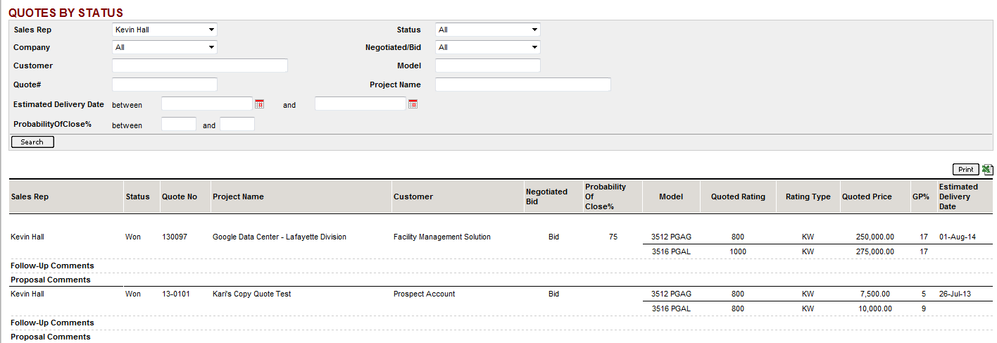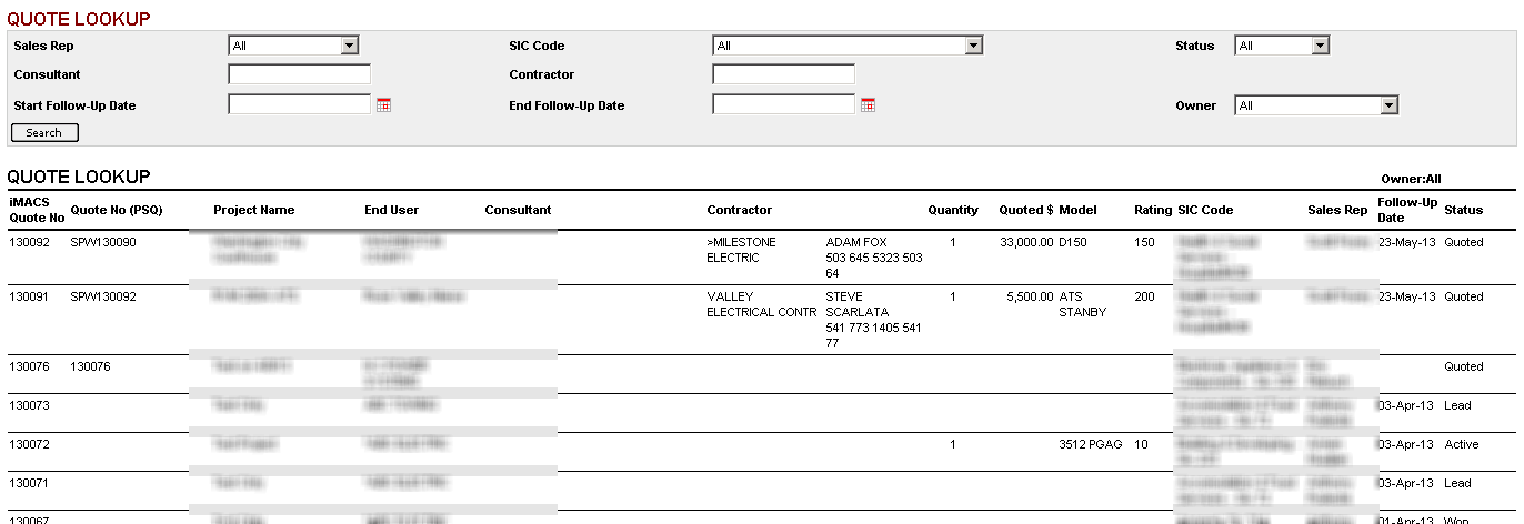 You can search for a quote by Sales Rep, SIC Code, Status, Contractor, Consultant, Start Follow-Up Date and End Follow-Up Date and generate a report.