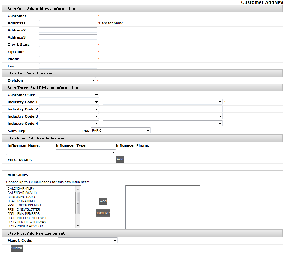 The Add New Customer and Add New Prospect Customer screens and the fields for these two functions are the same. What differs is the workflow of each. The Add New Customer option creates a Request for the primary SalesLink Gatekeeper responsible for the iMACS application. Use this option when you would like to add a customer to DBS.