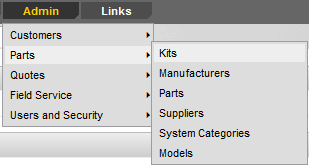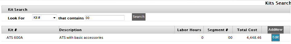 Look For parts kits by Kit # or Description, Edit kit information or add a new kit from the main search screen.