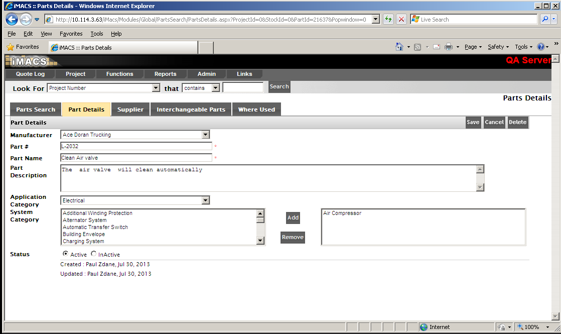 The Parts administration tools allow you to manage parts-related data in iMACS, including parts and kits, manufacturers and suppliers, system categories, and models.