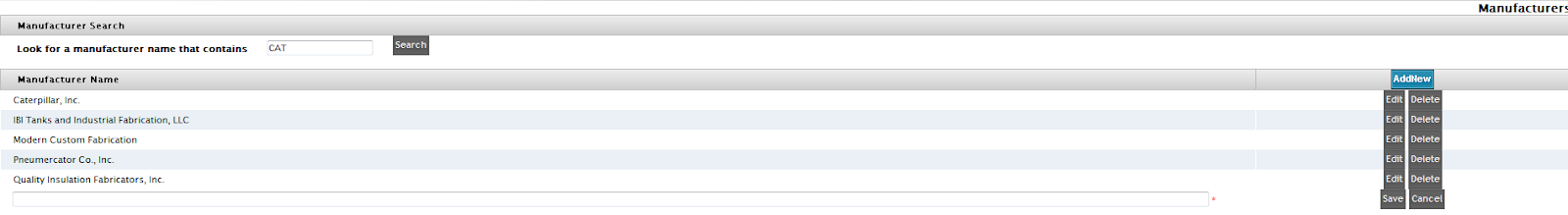 Manufacturers must be manually added in iMACS and assigned to an iMACS part. Prior to adding a part to the database, make sure that the associated manufacturer is available. Search through the list thoroughly to ensure that you don’t add a duplicate manufacturer. The AddNew function will add one field at the bottom of the list to add the Manufacturer Name. Click Save.