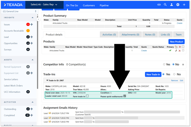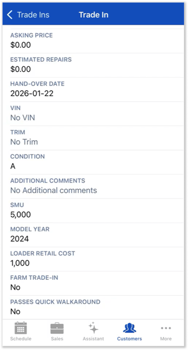 User-defined fields will also appear when viewing Trade-Ins in Equipment CRM Mobile!
