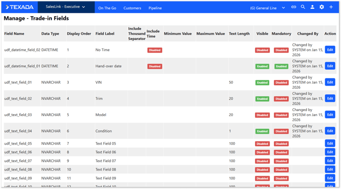 Support for user-defined fields for Trade-Ins has been added to Equipment CRM (SalesLink)! This feature allows your sales team to capture the exact equipment attributes that drive valuation and deal approvals, improving pricing accuracy, forecast quality, and close rates without forcing workarounds.