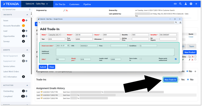 Open a Lead or Opportunity in Equipment CRM, then click the “New Trade-In” button to log a new Trade-In. Your user-defined fields will appear below the standard fields in the Add Trade-In window.