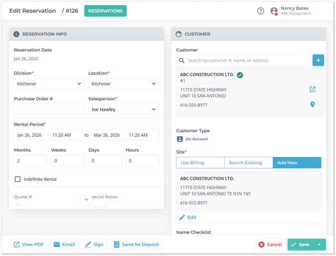 A Reservation is a pre-Contract document that allows an equipment salesperson to estimate the cost of a potential Contract and reserve equipment at the Group level. Once the client has provided their approval, a Reservation can be converted into a Contract.