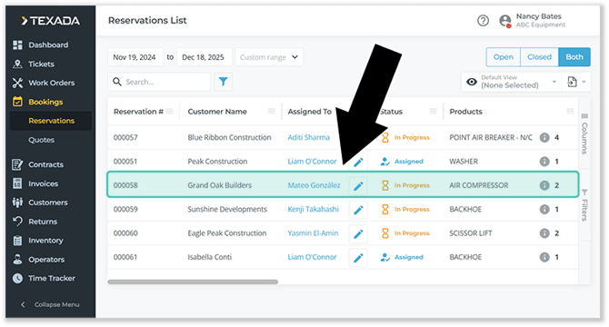 - Use the controls at the top of the the Reservations List page to search the list of Reservations for the one you’d like to view. Once you’ve located it, click on its row to open it.