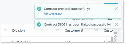 - Once the Contract has been successfully created, a pop-up will appear in the top-right corner of the screen. Click on the Contract’s number to quickly jump to its details page.