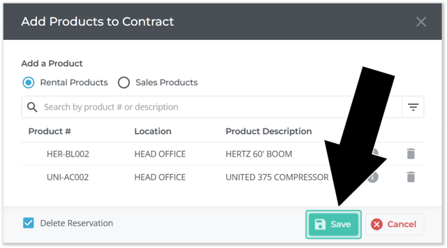 Once you’re finished adding Products, click “Save” to create a Contract. If the “Delete Reservation” checkbox is checked, the original Reservation will also be deleted at this time.