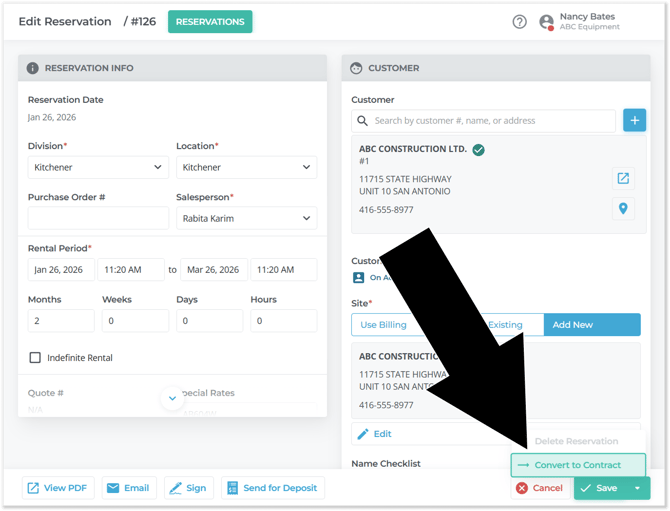 next to a Reservation on the left side of the Reservation List, then click the “Convert to Contract” button.