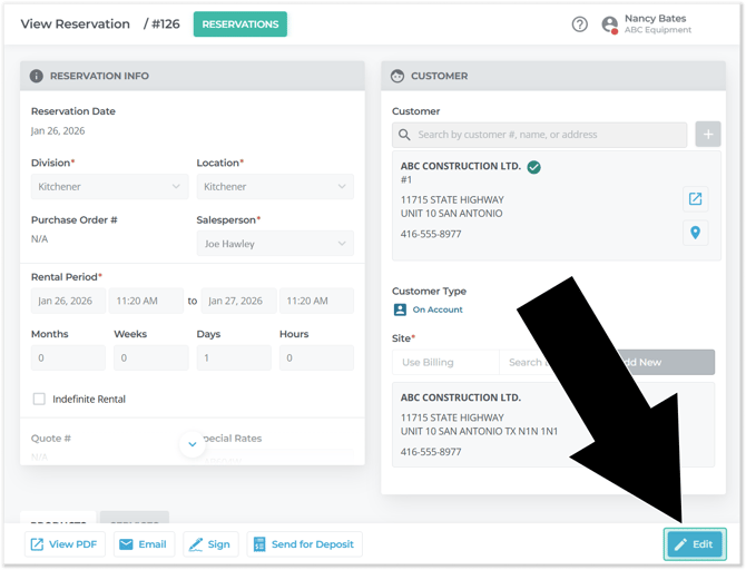 - Click the “Edit” button in the bottom-right corner of the View Reservation page to edit it.