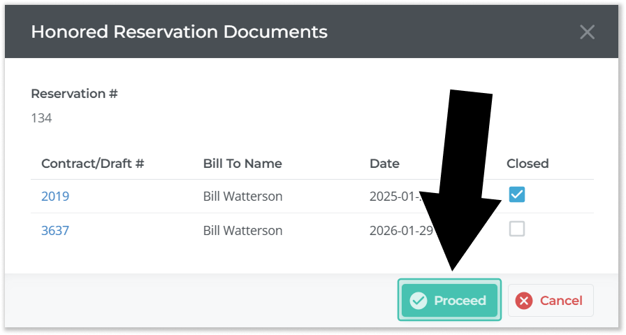 - If the Reservation you selected has previously been converted into a Contract, the Honored Reservation Documents window will appear. This window lists the Contracts that have been created from this Reservation and helps prevent duplicates from being created.