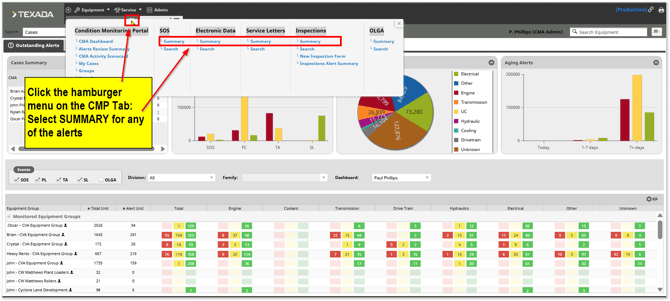 to the right of the “Condition Monitoring” tab, then select “Summary” for any alert type (SOS, Electronic Data, Service Letters, or Inspections).
