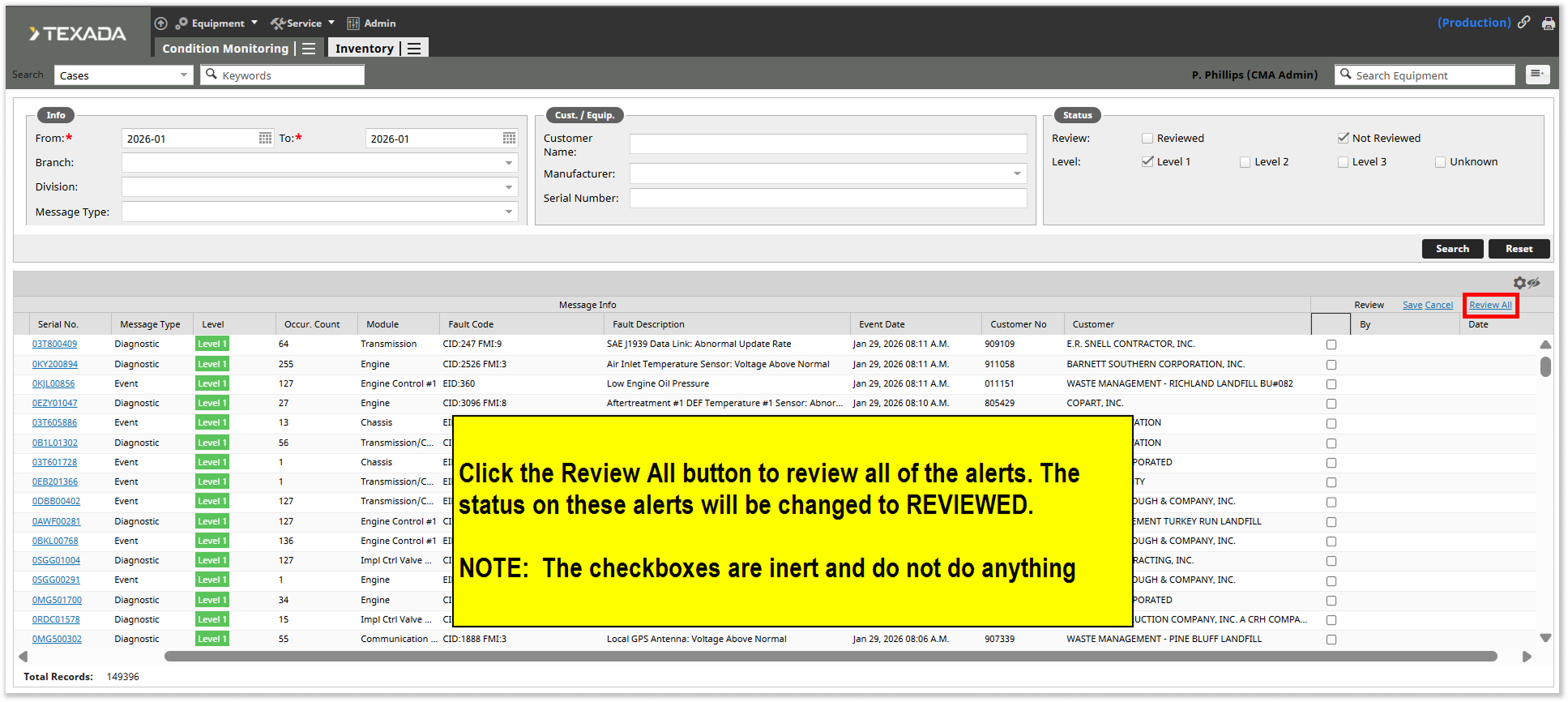 - Click the “Review All” button on the right side of the screen. This will set the status on all displayed alerts to “Reviewed”.