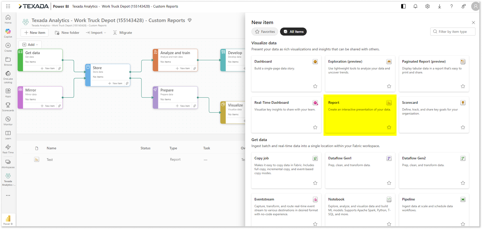 3. Select “Report”. You will now be able to select a Semantic Model and create your report.