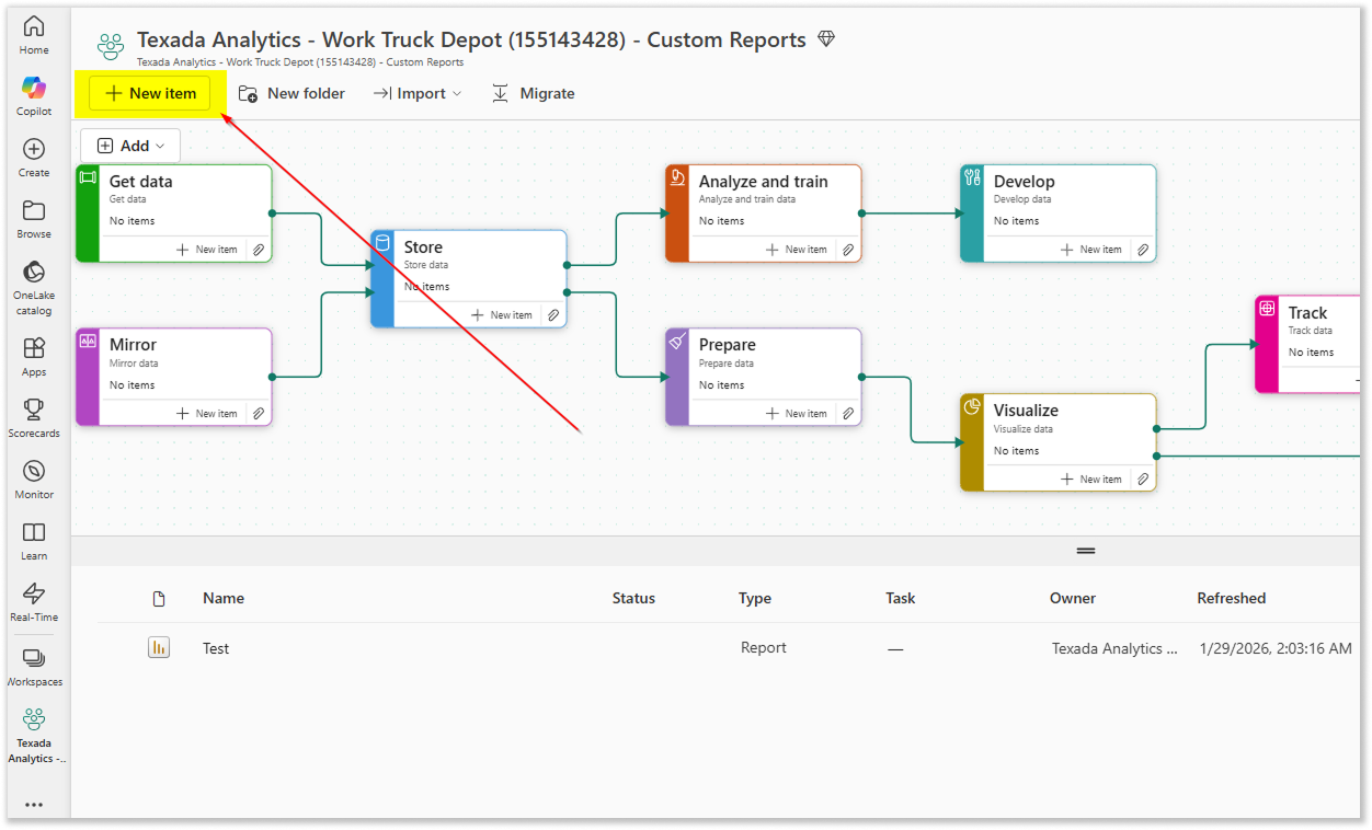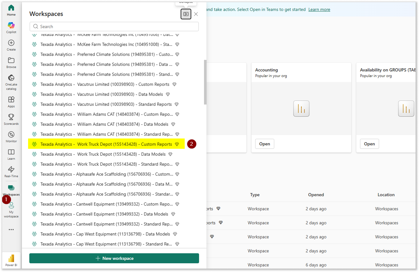 1. Log in to PowerBI. Select “Workspaces” from the left navigation menu, then select the workspace to which you’d like to add a custom report.