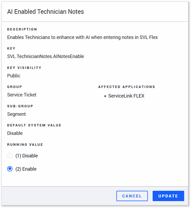This feature can be enabled and disabled via the “AI Enabled Technician Notes” (SVL.TechnicianNotes.AINotesEnable) configuration key in CloudLink Console. For more information, see “Manage Configuration Keys”.
