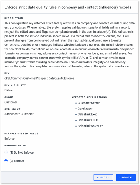 Data Quality Enforcement can be enabled and disabled via the Enforce strict data quality rules in company and contact (influencer) records (ckSLCommon.CustomerProspect.DataQuality.Enforce) configuration key in CloudLink Console. This key has two possible values: