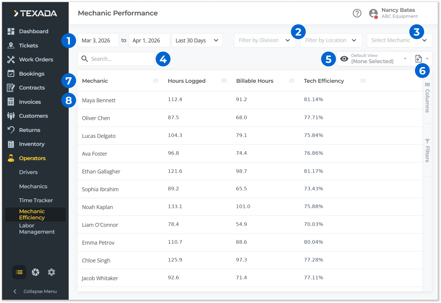 To reach this page, log in to Service, Rental, and Financials (Next), then select Operators → Mechanic Efficiency from the left navigation menu.