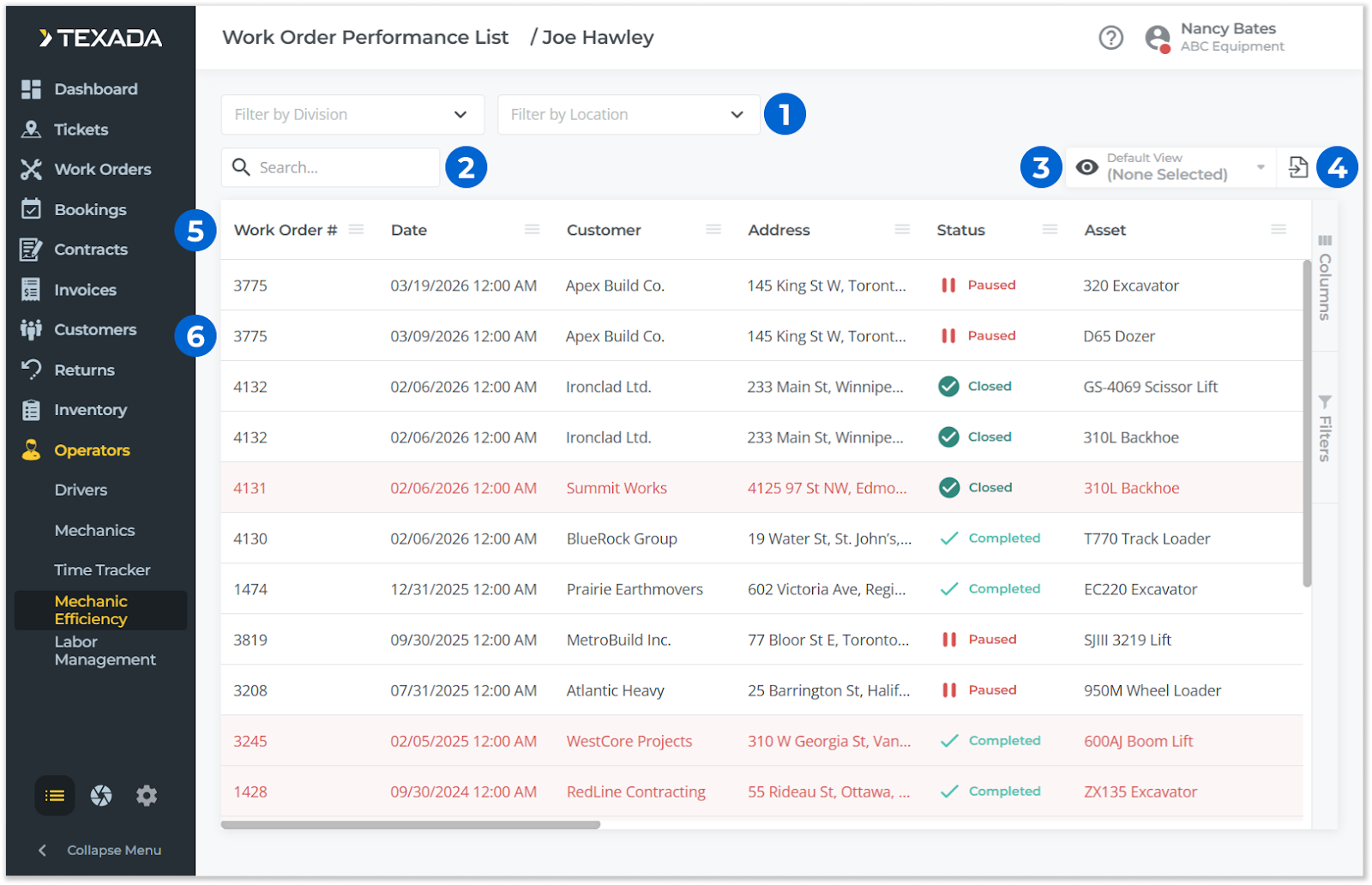 Click on a Mechanics’s row in the Mechanic Performance table to navigate to the Work Order Performance List. This screen provides a detailed view of a single Mechanic’s Work Order activity.