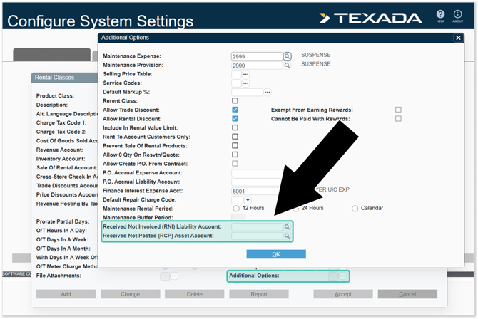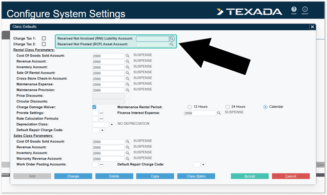 These accounts can be set at the Class level for both Rental Products and Sales Products. Additionally, you can use the Class Defaults utility to establish default RNI and RCP accounts.