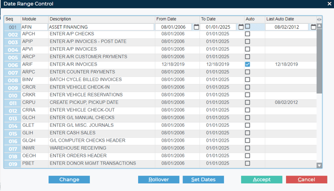 - Check the box under the “Auto” column for each of the items whose date ranges you want to automatically roll over.