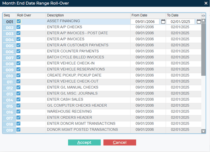 - Click “Accept” to roll the date ranges for the selected line items forward by exactly one month.