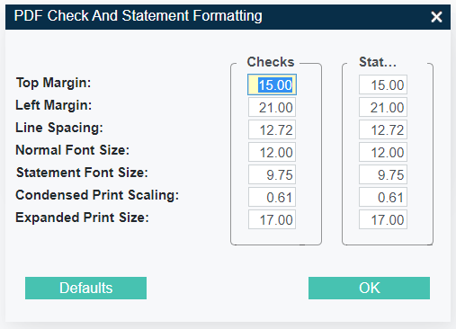 Use of a standard format listed above is necessary to provide proper alignment, however with small differences in printing software and printer hardware small adjustments may be required. This can be done when producing the checks, by modifying the PDF alignment.