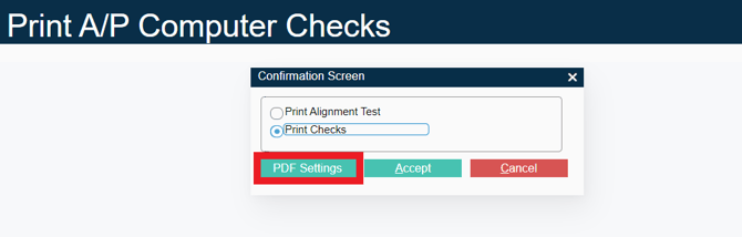 When running Accounts Payable → A/P Payments → Print A/P Computer Checks OR General Ledger → Checks → Print G/L Computer Checks, click Accept, and select PDF Settings on the confirmation screen: