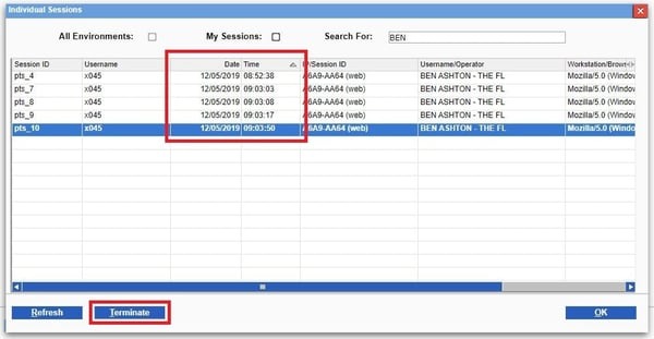 - Review your list of sessions, and sort them by Date/Time, oldest to newest. This time is the Date/Time that the session logged in, so all older sessions from your most current session are now lost and can be terminated: