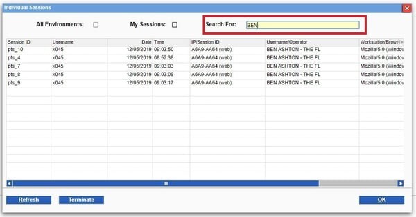 - Depending on the size of your company, you may see many lines of Operators logged into the application. To filter these results to your own sessions, search for your name or Operator Code in the Search For field at the top of the window: