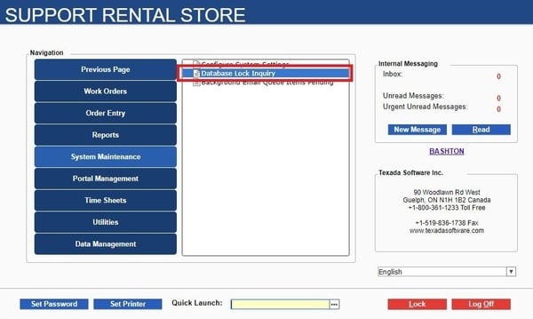 - Log in to Service, Rental, and Financials (Classic) and navigate to System Maintenance → Database Lock Inquiry. If you do not see this menu option, speak to your administrator to review and update your menu security options.