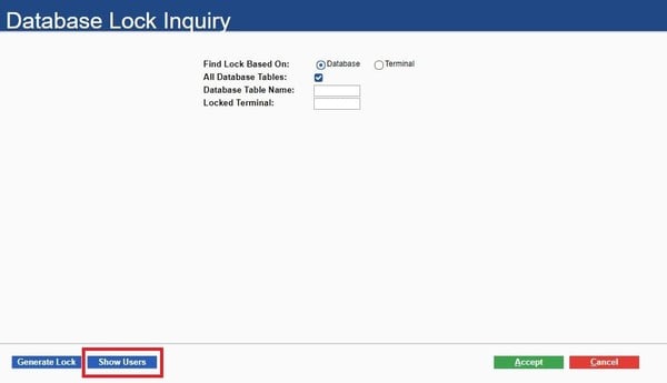 - At the bottom left of the Database Lock Inquiry, select the Show Users button: