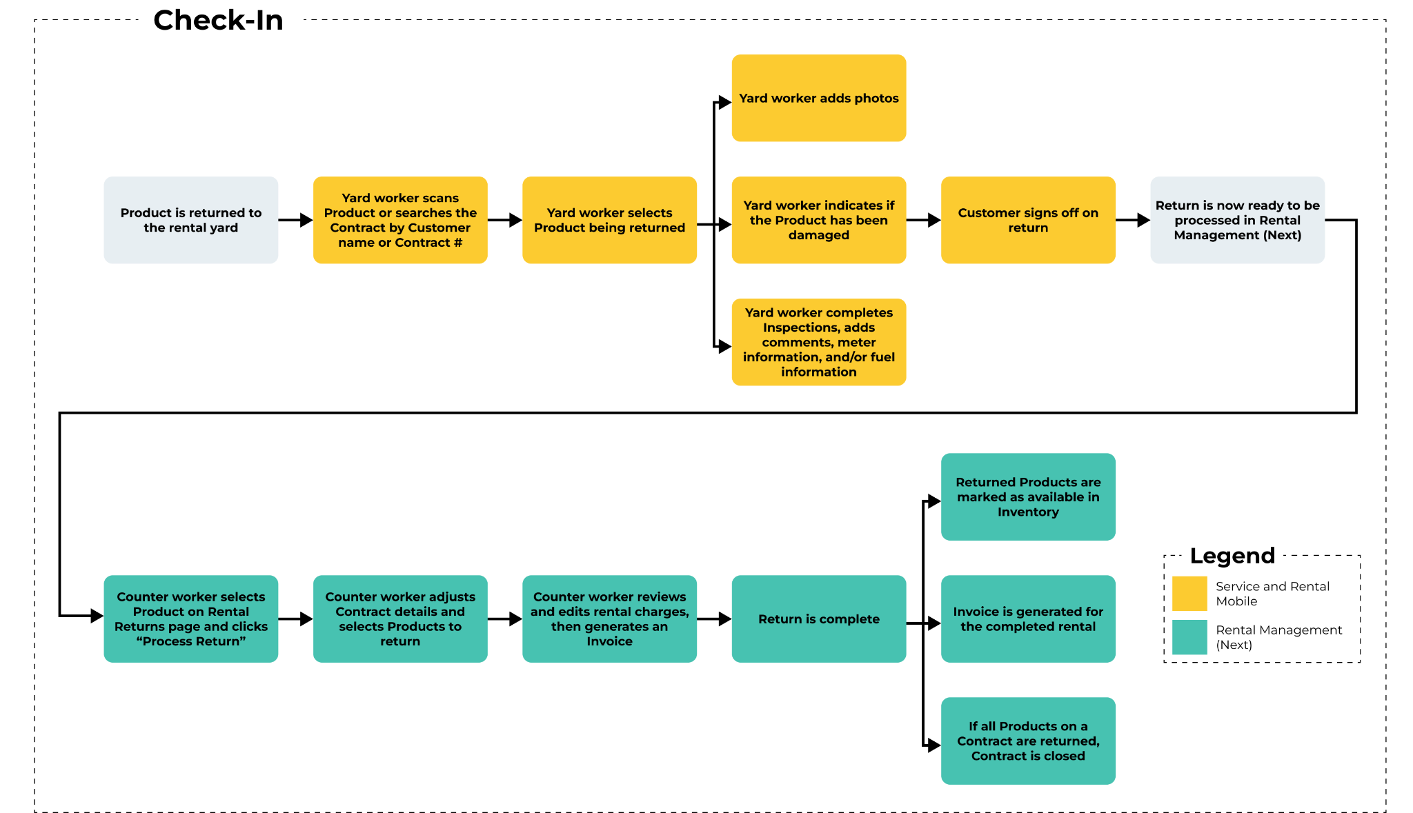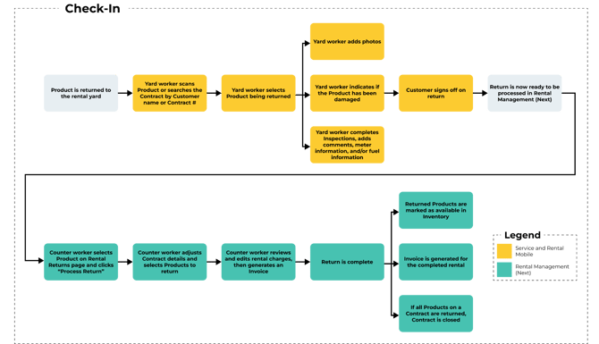A Check-In is a Return that is initiated by a yard worker using Service and Rental Mobile, then processed by a counter worker using Rental Management (Next). Check-Ins are used when Products are returned directly to the rental yard instead of the counter.