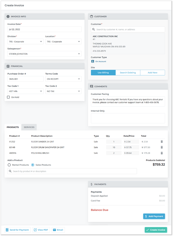 - Fill out the information for your Invoice, including at least an Invoice Date, Division, Location, Salesperson, Customer, and at least one Product or Service.