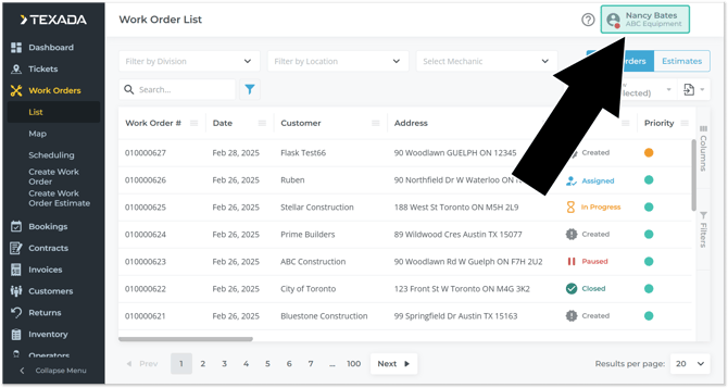 To reach the User Menu, click on your name in the top-right corner of Service, Rental, and Financials (Next).