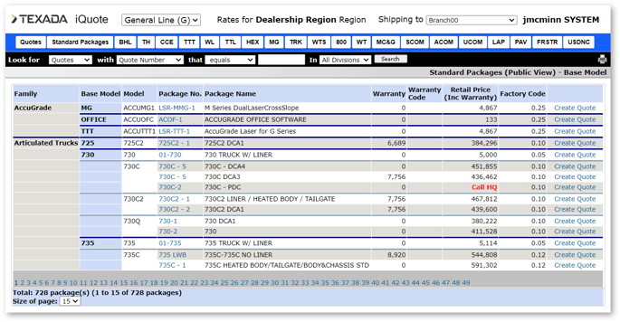 The list includes the model name as ordered from the factory, the name of the Standard Package for that model or the Caterpillar MA, the cost of the warranty, Retail Price, Factory Code, and a [Create Quote] button.