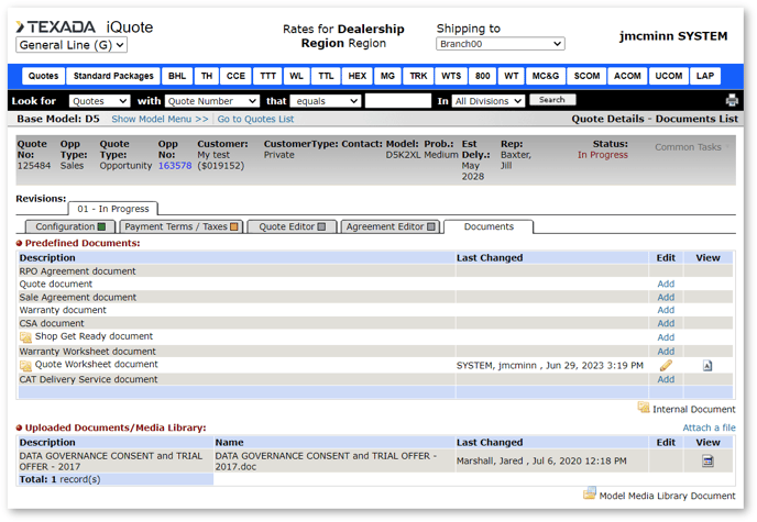 This document was developed to allow dealers to save the Quote Worksheet in PDF format and contains the quote Configuration, Financial, and Payment Terms. Each revision has its own document and is displayed on the document list. The document can be viewed using the PDF icon