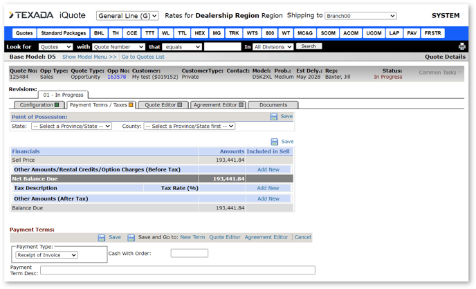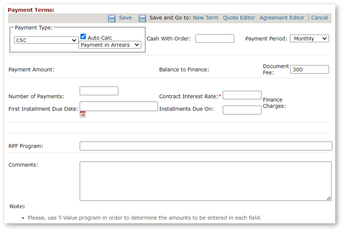 When completed, click New Term at the top to add another option, Quote Editor to change the quote, Agreement Editor to print a Sales Agreement without a quote, or Save Only to stay on the page.