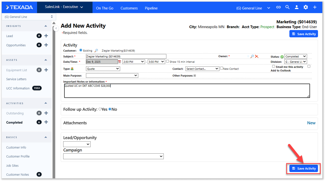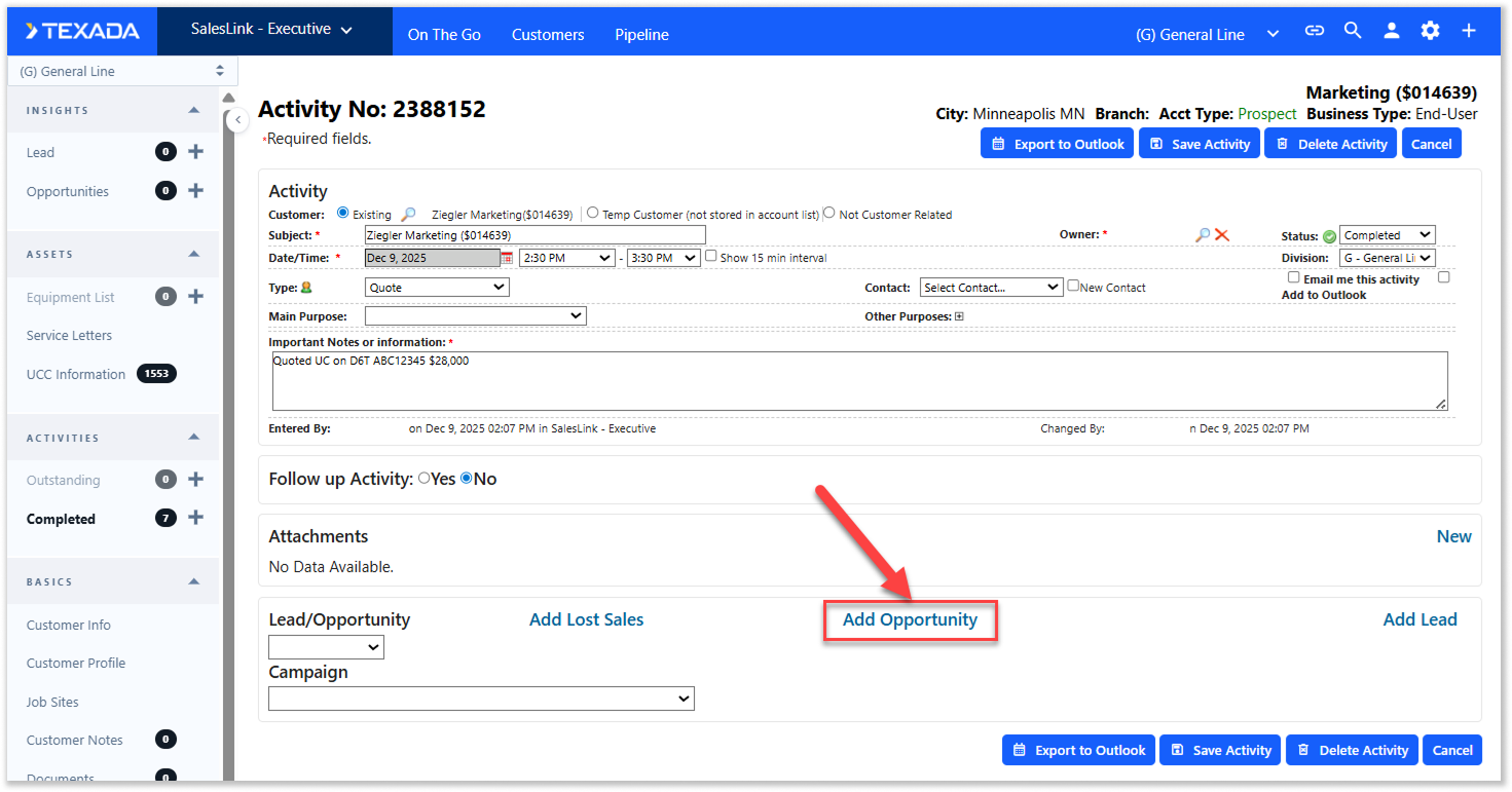 Click on the Activity Number to view the activity’s details, the Customer Number to view the associated customer details, or the Opportunity Number to view the associated opportunity details (if available).