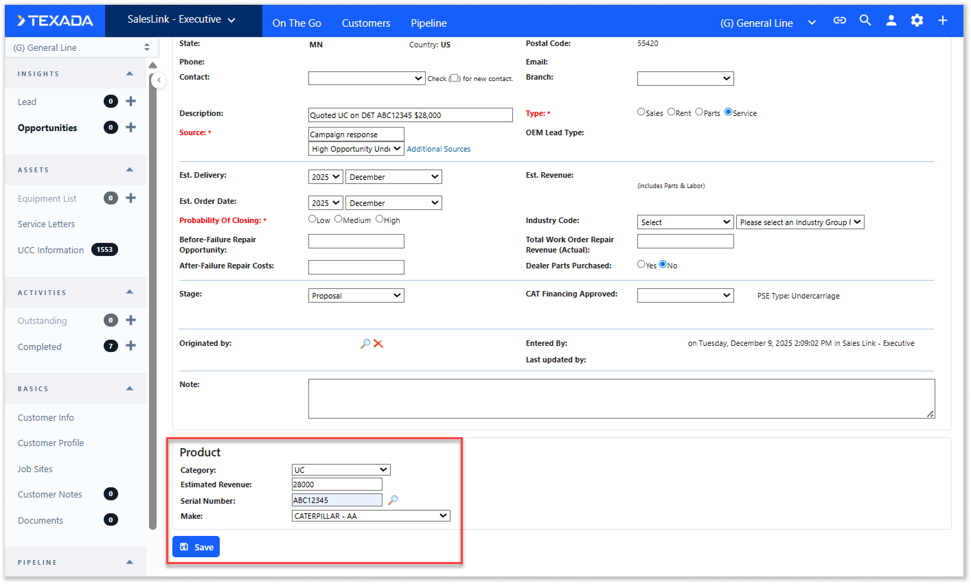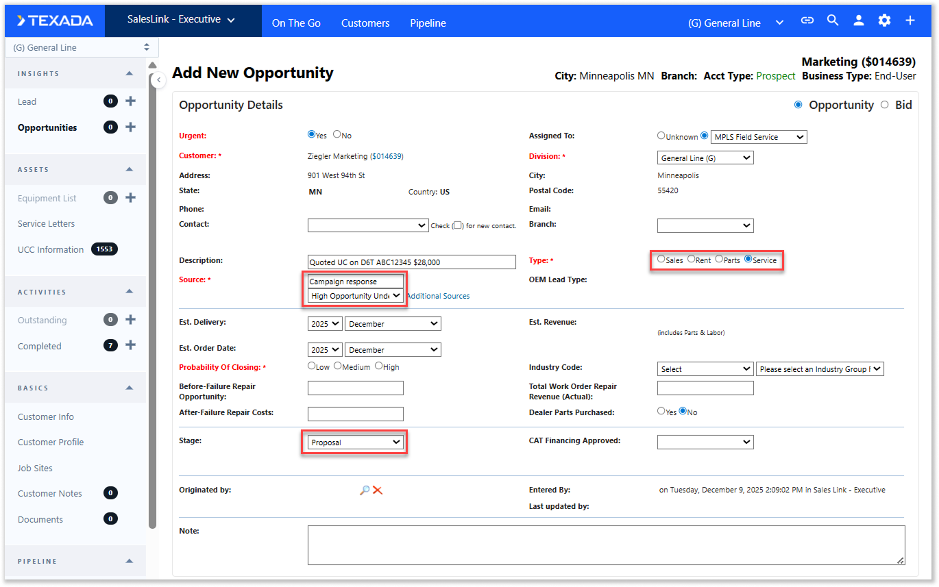 - Enter the details of your Opportunity, including at minimum a Type, Source, and update Stage.