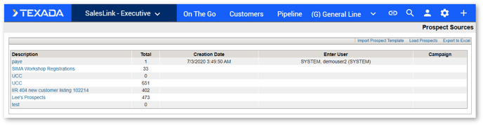Click the Prospect Sources link under CUSTOMERS in the top navigation bar. The Prospect Sources page displays.