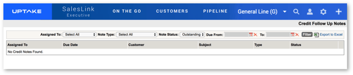 Click the A/R Notes List link under ON THE GO in the top navigation bar. The Credit Follow Up Notes page displays.