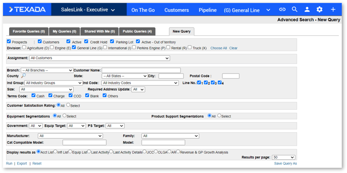 To run an advanced search for customers or prospects, click the Advanced Search link under CUSTOMERS in the top navigation bar. The Advanced Search – New Query page displays.